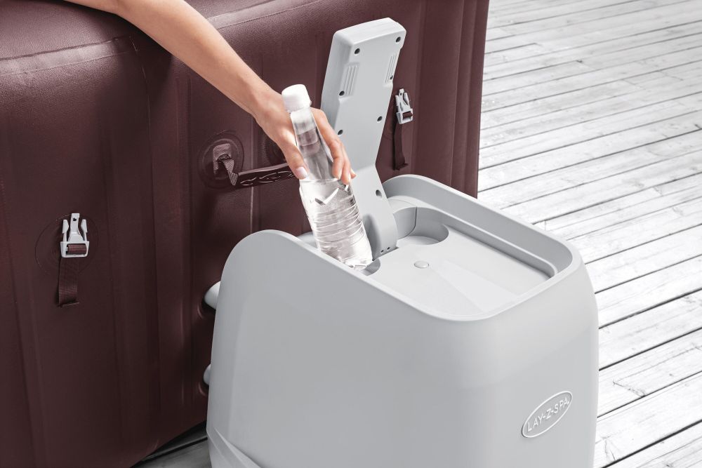 Hlavní ovládací jednotka zajišťuje všechny provozní funkce vířivého bazénu a to výkonnou kartušovou filtraci, průtokový digitálně nastavitelný ohřev až do 40°C, vzduchový kompresor pro nafouknutí a následné zásobování vzduchových a masážních trysek.