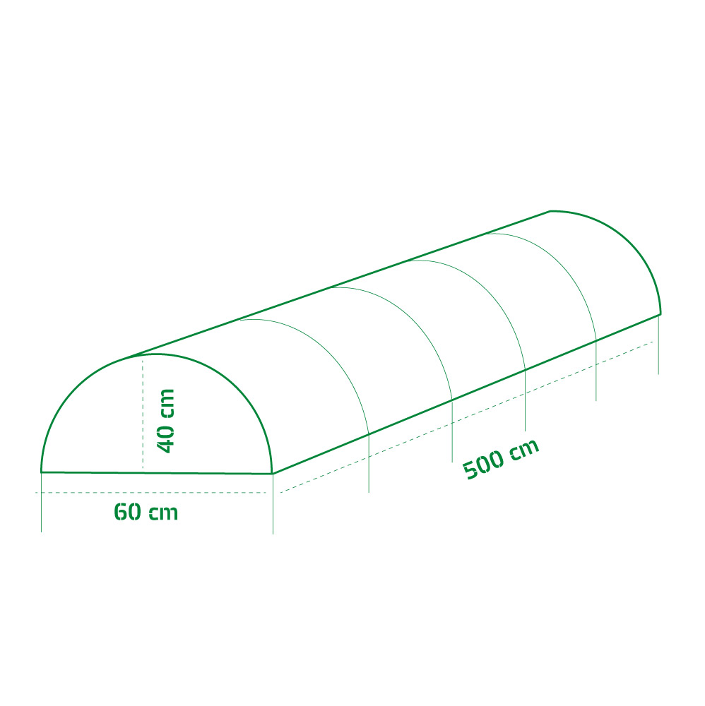 - délka 500 cm- šířka 60 cm- výška 40 cm- materiál bílá netkaná textilie- průměr nerezového drátu 2,6 mm- gramáž textílie 60g/ m2Na zahradní tunel poskytujeme záruku v délce 24 měsíců.